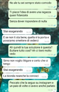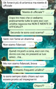 “Quando mi dicono che sono una ragazza gelosa, vado veramente fuori di testa. Chiariamo questo punto una volta per tutta. La gelosia esiste, ed è negativa, quando completamente ingiustificata e basata solamente su un sentimento morboso che è tutto tranne che amore. Questa è gelosia. Tutto il resto è buon senso e non accetto che si critichi. Perché una fidanzata deve poter sapere cosa fa il suo fidanzato quando non è con lei, perlomeno in via generale e senza che si nasconda nulla. E se ci sono dei segnali che nascono dei problemi, è diritto della fidanzata (ma anche del fidanzato nel caso opposto) di indagare per capire che succede. Questa non è gelosia ma sano buon senso. E così ho fatto. Il mio ragazzo, almeno credevo lo fosse dopo 3 mesi a vederci tutte le sere, una sera non era con me e non mi ha voluto dire dove fosse e con chi. Allora l’ho seguito. Era l’unica decisione sensata possibile e non me ne pento, soprattutto per com’è andata dopo. Ma, sinceramente, quello che ho scoperto mi ha lasciata completamente senza parole.”