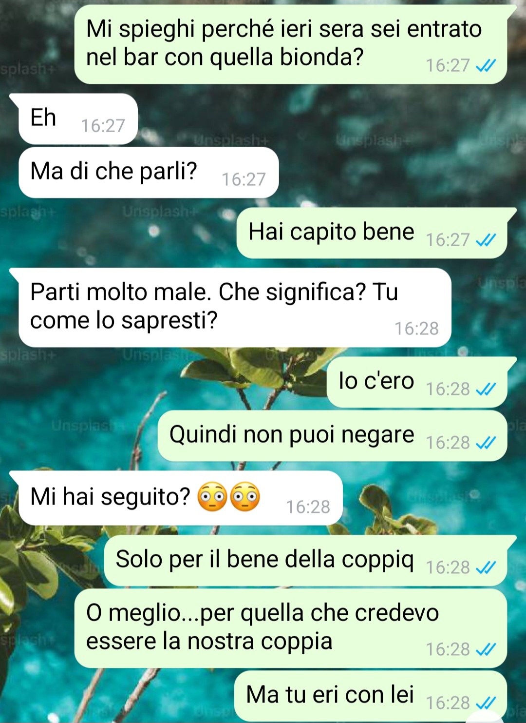 “Quando mi dicono che sono una ragazza gelosa, vado veramente fuori di testa. Chiariamo questo punto una volta per tutta. La gelosia esiste, ed è negativa, quando completamente ingiustificata e basata solamente su un sentimento morboso che è tutto tranne che amore. Questa è gelosia. Tutto il resto è buon senso e non accetto che si critichi. Perché una fidanzata deve poter sapere cosa fa il suo fidanzato quando non è con lei, perlomeno in via generale e senza che si nasconda nulla. E se ci sono dei segnali che nascono dei problemi, è diritto della fidanzata (ma anche del fidanzato nel caso opposto) di indagare per capire che succede. Questa non è gelosia ma sano buon senso. E così ho fatto. Il mio ragazzo, almeno credevo lo fosse dopo 3 mesi a vederci tutte le sere, una sera non era con me e non mi ha voluto dire dove fosse e con chi. Allora l’ho seguito. Era l’unica decisione sensata possibile e non me ne pento, soprattutto per com’è andata dopo. Ma, sinceramente, quello che ho scoperto mi ha lasciata completamente senza parole.”