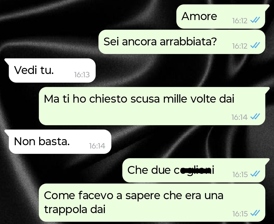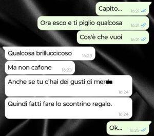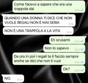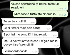 Il problema è che lei il regalo se lo aspettava. Io forse sono stato superficiale ma sinceramente non sapevo che le donne quando dicono una cosa ne intendono un’altra. Questa è la mia prima relazione seria e sto ancora imparando… lei dice che ci dovevo arrivare da solo. Mah.