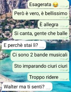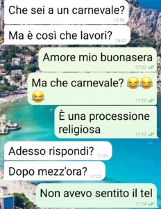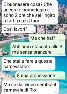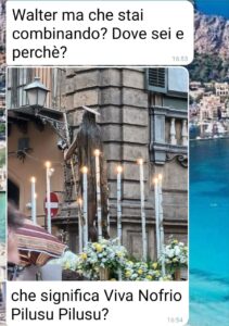 Ciao ragazzi io sono Walter e questa è la chat con la mia fidanzata. Prima di tutto una considerazione, una cosa che ho imparato, tardi ma ho imparato. Provare prima di giudicare qualsiasi cosa. Io ho provato e mi sono ricreduto: su una città, i suoi abitanti, i miei preconcetti. Chiusa parentesi. Lavoro per una ditta di assistenza a particolari macchinari che dopo un anno in una cittadina del nord (non la cito perché in chat non ne parlo benissimo) mi ha mandato a Palermo inizialmente per 4 giorni. Sono poi diventate 2 settimane (con mia gioia) fino a questo sabato (in cui ho lavorato fino alle 15, tanto per chiarire…), ovvero fino al momento in cui Lei diventa una pazza vedendo le foto della processione di Santo Onofrio. Leggete questa chat e ditemi se, polentonia o terronia, è normale che una persona ragioni in questo modo. Io voglio andare per la mia strada”
