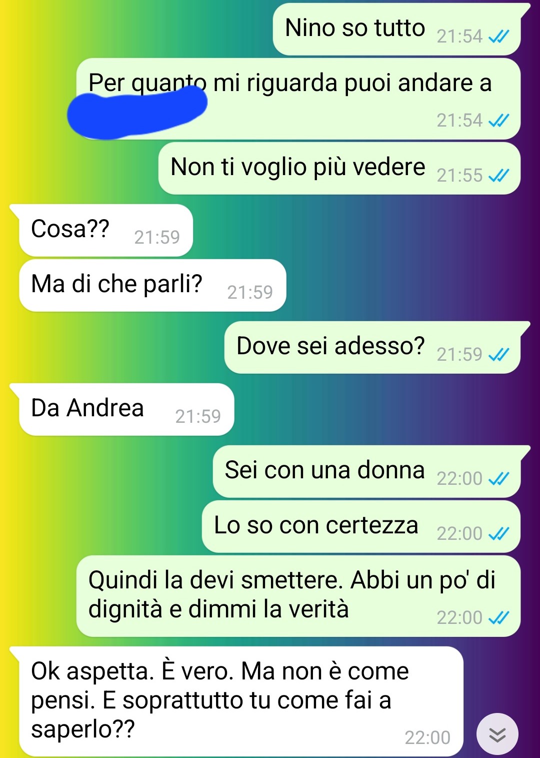“Sapete qual è la cosa che mi fa più ridere? Che io mi sono tenuta vicino questa persona per mesi, e chissà quante volte si sarà trovato, a mia insaputa, in situazioni simili a quella che state per leggere. E non mi sono mai accorta di niente. E non venitemi a dire che sono io che sono di mentalità chiusa, che non capisco o che non dovrei comportarmi così. Per me è assurdo solo pensare il contrario. Ma che partner siete? Chi lascia correre, chi non si batte per il proprio amore, chi non è geloso, non ama, questa è l’amara verità. Poi ci si può nascondere dietro a dei muri di vetri, ma questa è l’unica verità. Stavo con Nino appunto da mesi quando una sera, e già questo è strano e quasi inaccettabile, mi dice che non ci possiamo vedere perché ha altro da fare, senza spiegarmi cosa deve fare, dove e con chi. Grazie ad un colpo di fortuna riesco a scoprire di più sulla sua serata e la notizia mi lascia completamente allibita. L’unica cosa che potevo fare e scrivergli e chiudere questa questione una volta per tutto. Io alla mia dignità ci tengo, non so voi.”