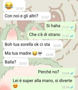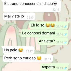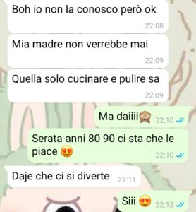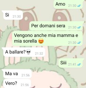 Mi chiamo Arianna, sono una ragazza di 21 anni e vi scrivo perché il ragazzo con cui mi sono frequentata / conosciuta per qualche tempo ho scoperto che è un viscido!!! Non lo conoscevo da moltissimo, non avevamo nemmeno definito di essere una coppia, eravamo in fase esplorativa diciamo, però ci sono comunque stata male più che altro per delle insicurezze mie, ma vabbè. E’ stato un “meglio perderla che trovarla gente così”. Per farvi capire, io non conoscevo la sua famiglia, lui non conosceva la mia, ma tramite amici avevamo accorpato il nostro gruppo e avevamo iniziato ad uscire insieme. Avevamo organizzato in gruppo di andare a ballare ad una serata anni ottanta novanta e la conversazione che vi mando risale alla sera prima. Essendo una serata particolare, anche mia mamma e mia sorella volevano partecipare e così glielo ho comunicato, ma da lì c’è stato un declino. Inutile dirvi che non ha mai più conosciuto i miei, se non forse il tacco 12 di mia madre che lei voleva tirargli.”