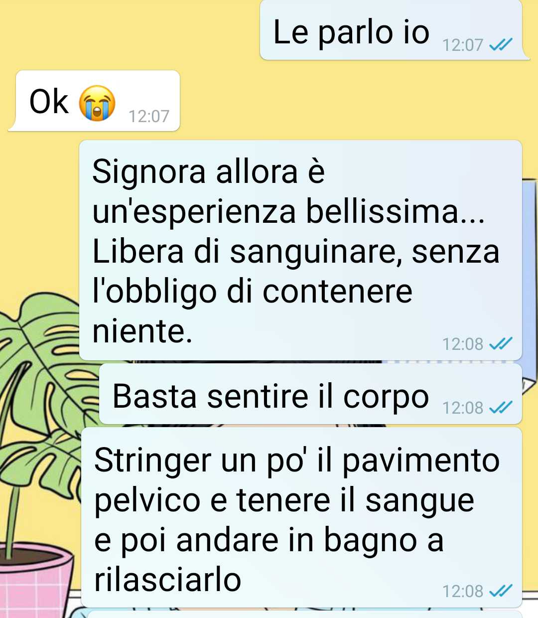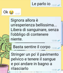 Le ho detto che potrebbe essere un’esperienza fare il free bleeding proprio degli ultimi cicli… Vi dico solo che il mio ragazzo c’è rimasto male e non l’ho trovato carino.”