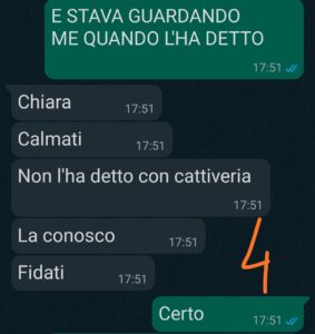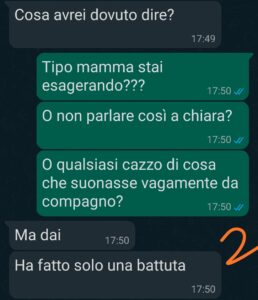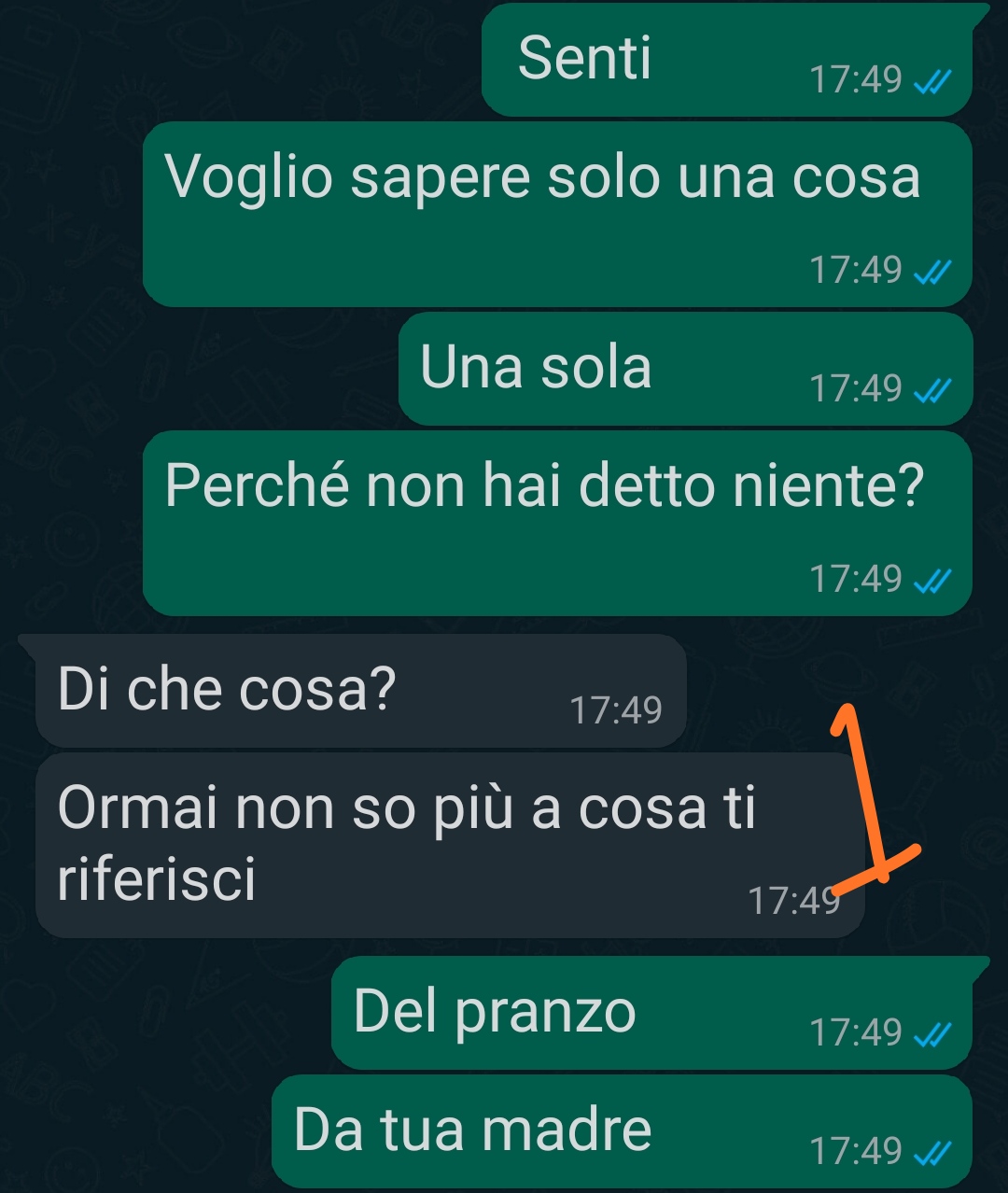“Non mi aspettavo di essere difesa con una spada. Ma almeno con una frase, sì. Una parola. Uno sguardo. Qualcosa che mi facesse capire che ero al sicuro, anche tra la sua famiglia. E invece no. Sono rimasta lì, zitta, con le guance che mi bruciavano, mentre sua madre mi faceva a pezzi davanti a tutti. E lui? Ha fatto finta di niente. Ha preso un’oliva. Ha continuato a mangiare. Questa è la nostra chat, quella che è arrivata dopo quel pranzo. Quando ormai non avevo più fame, né di cibo né di scuse.”
