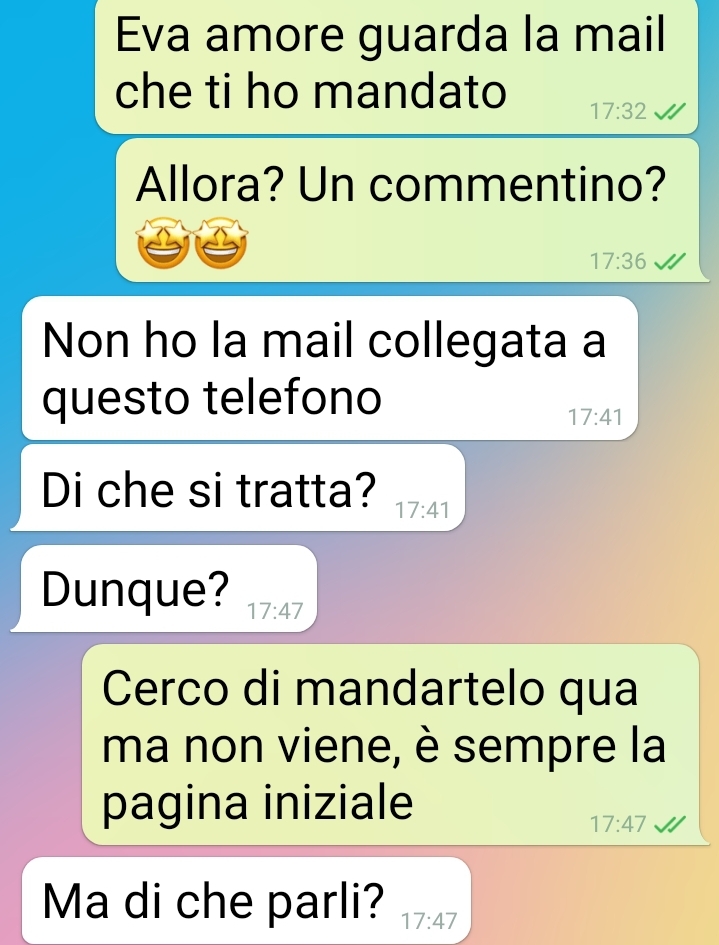“Io sono Pippo per tutti e questa qua è la discussione in cui Eva mi ha trascinato e sconfitto poco fa. Non so bene che fare adesso e quindi scrivo a voi, tanto peggio di così non può andare. Non vedo come potrebbe…
