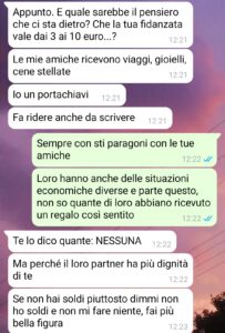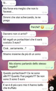 “Ci sono coppie che fanno dell’amore una gara a chi spende di più, come se il valore di un sentimento si misurasse in scontrini e fatture. Io invece ho sempre pensato che i soldi siano un mezzo, non un metro di giudizio: possono facilitare, regalare comodità, creare esperienze… ma non sono loro a dire se una relazione è solida o no. Il rischio, quando ci si abitua a valutare tutto in termini economici, è che anche i gesti più sinceri vengano etichettati come “poveri” o “inadeguati”, mentre quelli scintillanti ma vuoti passino per dimostrazioni di amore. Mi capita spesso di guardarmi intorno e notare come tante persone ormai vivano più per la foto da postare che per il momento da ricordare. Un regalo, un’uscita, perfino un abbraccio diventano occasioni da immortalare, più che emozioni da custodire. E così, lentamente, si perde di vista l’essenziale: il fatto che ciò che conta non è quanto costa, ma quanto pesa nel cuore di chi lo offre. Era il compleanno della mia fidanzata. Ero innamorato, ho visto un regalo che, seppur non molto costoso, mi ha riempito il cuore e allora ho deciso di comprarlo. Non l’avessi mai fatto…”