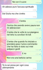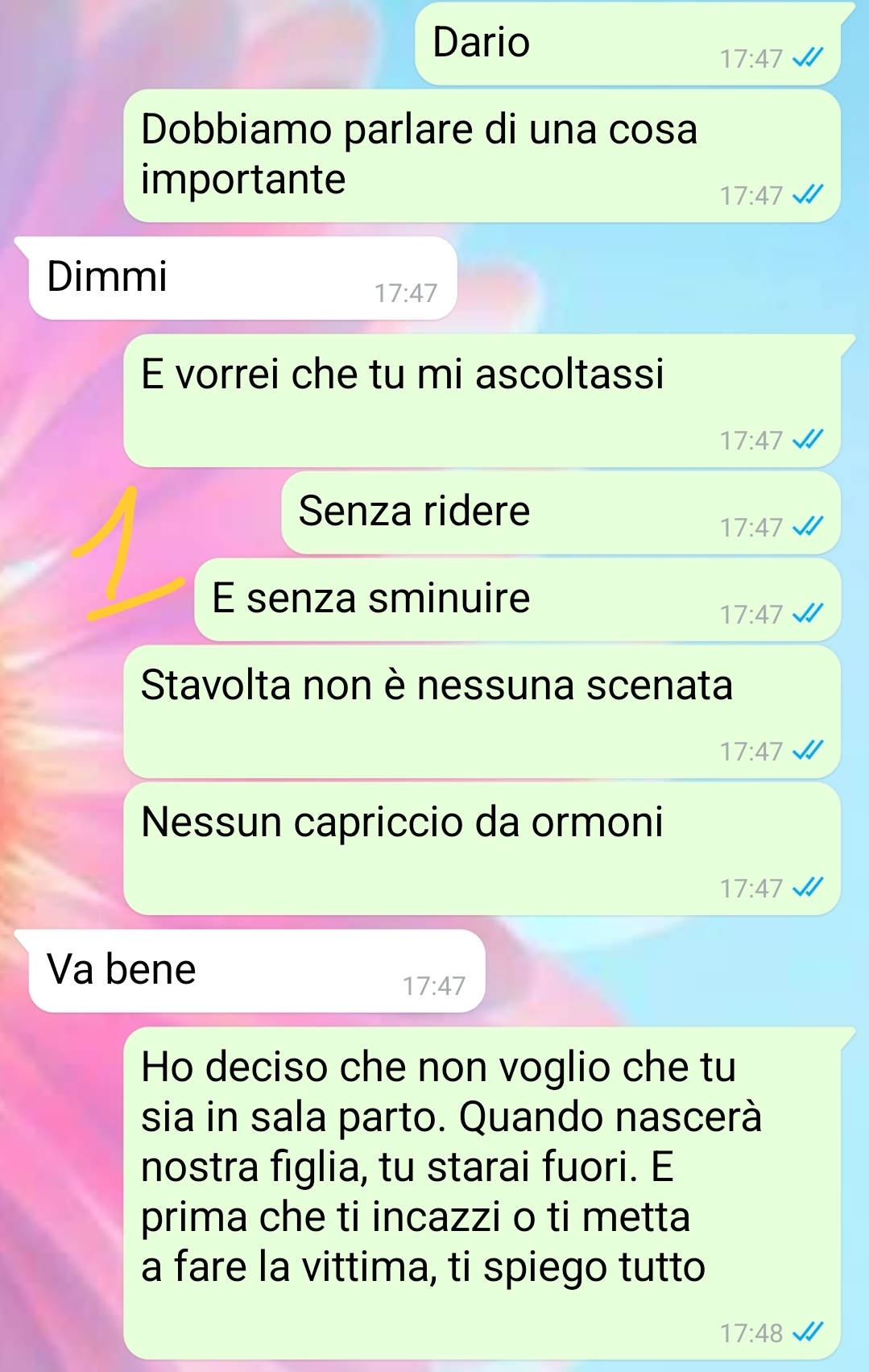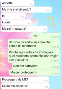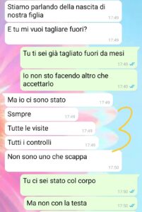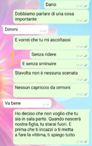 “No, non è una minaccia. Non è neanche una ripicca. È una scelta. Dolorosa, sì, ma necessaria. Quando ho detto a Dario che non volevo la sua presenza in sala parto, sapevo che avremmo litigato. Che avrebbe tirato fuori parole come “umiliazione”, “padre”, “famiglia”. Ma in quel momento, per me, contava solo una cosa: sentirmi al sicuro. E negli ultimi mesi Dario non è stato quel posto sicuro. Battute fuori luogo, leggerezze continue, promesse mai mantenute. Ogni giorno un peso in più sulle mie spalle, e ogni volta un sorriso per non discutere. Questa volta no. Questa volta non ci sto. Non perché non lo amo, ma perché ho smesso di amare la versione di me che taceva per quieto vivere. Questa chat racconta un confine che ho tracciato. Non per vendetta, ma per rispetto. Per me, per mia figlia, e — forse un giorno — anche per lui.”