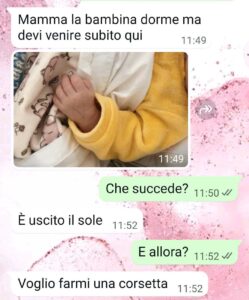 So che è una neomamma ed è un momento difficile ma io ci sono ma non sempre sempre. Vorrei farglielo capire ma è difficile parlare con lei. Non sono una persona forte, cioè lo sono, ma ho le mie debolezze. Sono stata male un paio di anni fa, molto male. Ora sto meglio.