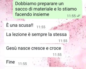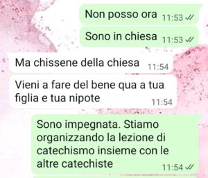 Mi sono tanto legata a Dio, a Gesù che mi aiuta a sentirmi più serena. Sono catechista da tanti anni, ma ora la sfida è diventata più difficile. Ci viene richiesto di preparare molto materiale per i bambini ed è faticoso. Ma non so se dovrò lasciare questo impegno visto che sono diventata nonna. Non ho il tempo per tutto e mi dispiace abbandonare il catechismo ma mia figlia mi reclama. Ma la mia vita che fine fa?”