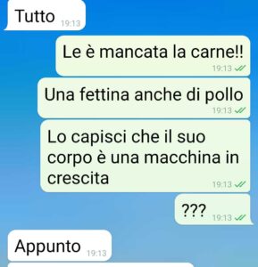 io sono una mamma che lavora, lavora a tempo pieno, non ho tempo per gestire questi capricci, non ho tempo per combattere con mia suocera che mi sta letteralmente facendo impazzire. e mi preoccupo di questi giorni che la bambina passa a casa da sua nonna, giorni in cui la bambina mangia malissimo le viene mal di pancia perché mangia troppe fibre a cui non è abituata. è una bambina di 4 anni Ed è in piena crescita Come può crescere senza le proteine animali??? come farlo capire a mia suocera???”
