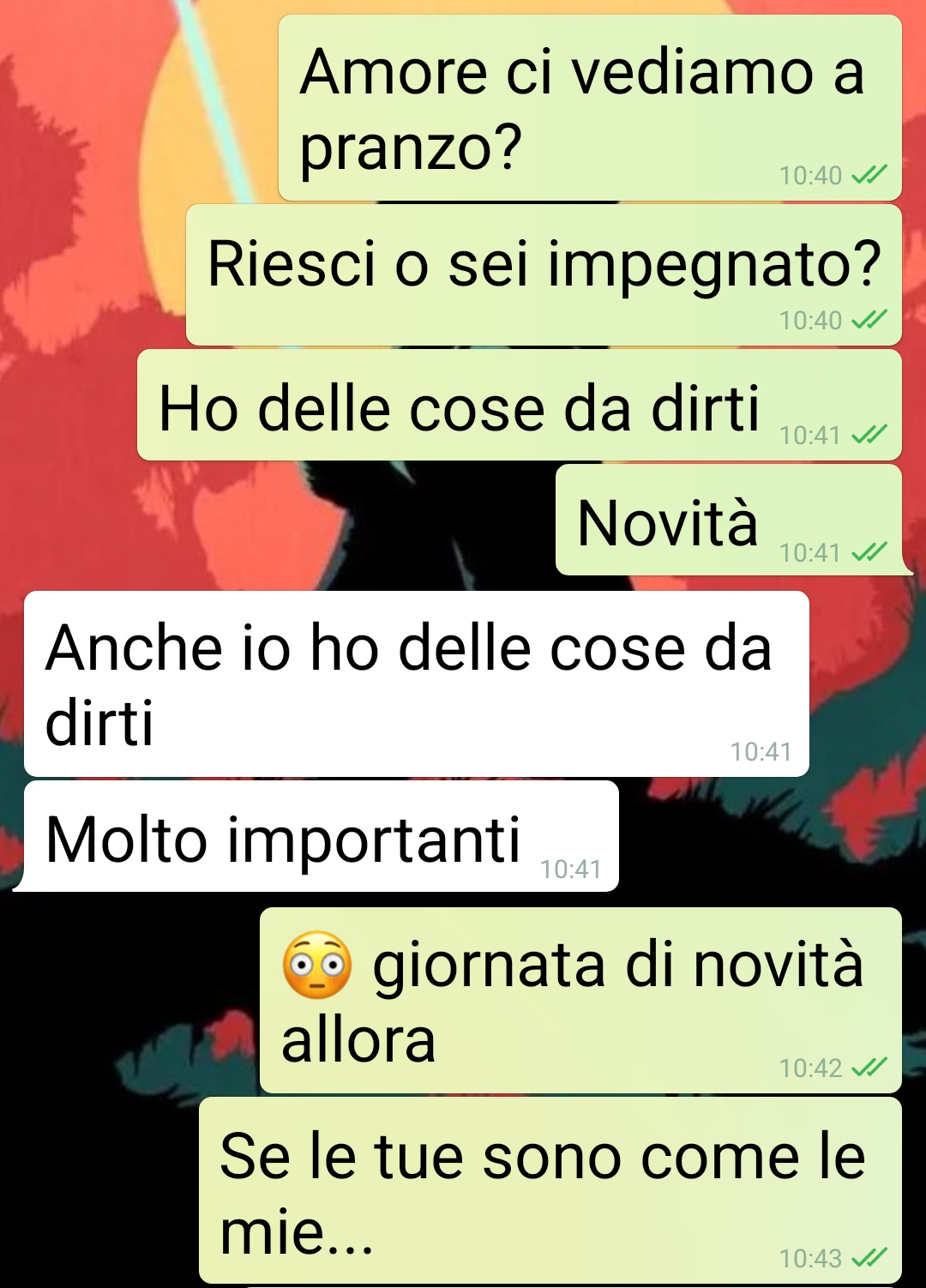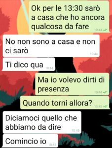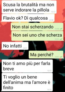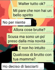 Io sono Flavio ragazzi di spunte e oggi è una giornata che non so descrivere. Davvero non ho aggettivi. Ho passato 9 mesi di inferno, gli ultimi fino ad oggi, per il lavoro. Sono stato licenziato e denunciato dalla mia azienda per illeciti vari. Ma io ero innocente! Una guerra logorante, che mi ha portato praticamente sul lastrico, senza entrate e a dilapidare le mie risorse per far valere le mie ragioni. E con la banca che mi stava per togliere la casa, dati i 6 mesi di mutuo non pagato. Ho resistito e combattuto grazia alla mia roccia, Walter, a cui mi sono aggrappato. L’unico motivo per cui ho combattuto strenuamente. E oggi, che finalmente sono uscito vincitore dalla diatriba sono più triste di prima. Scrivo a Walter ma lui mi precede con una sua di novità. Mi lascia. Non mi ama più. Tutto negli screen, dall’inizio alla fine, rivelazioni e risvolti inclusi”