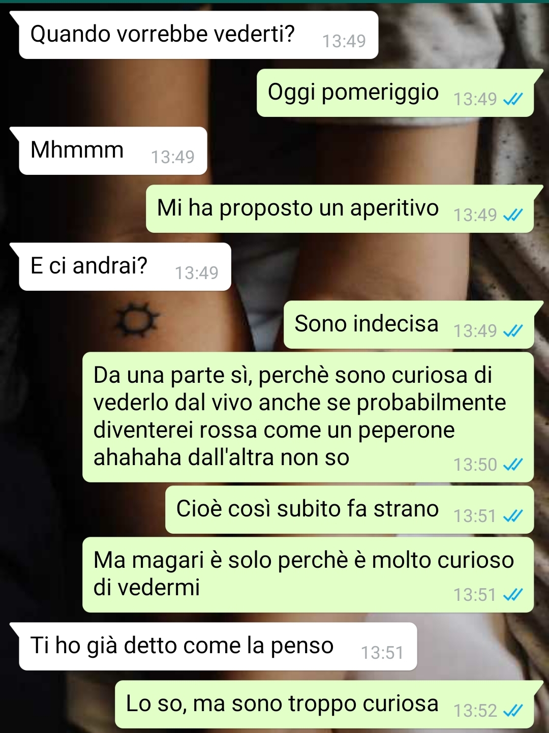 “Ed ecco che esco per andare all’appuntamento. Non vi nascondo che ero molto nervosa. Non vi anticipo troppo perché lo scoprirete nelle chat che ho avuto dopo con Giulia… vi dico solo che mai mi sarei aspettata una giornata del genere.”