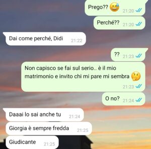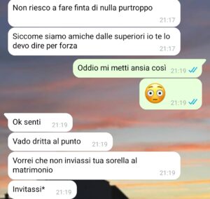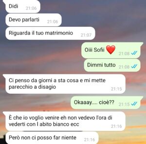 Tra questi, a quanto pare, c’era qualcuno che Sofia non gradiva e ha PRETESO che io disinvitassi questa persona perché secondo lei non si merita di venire al MIO matrimonio.