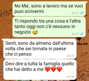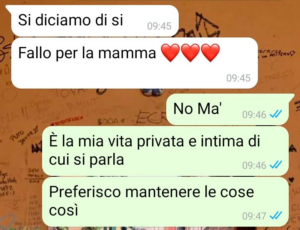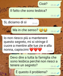“Ciao ragazzi di SpunteBlu, sono Clarissa sono una ragazza di 33 anni, con un negozio a Bologna, e sono lesbica. Quest’ultima parte della mia vita l’ho detta, dopo tantissimi anni, a mia madre. Grave errore. Mia madre è una di quelle che non sa tenersi la bocca chiusa, e ama i pettegolezzi e i gossip spiccioli. Per questo io e lei abbiamo litigato varie volte nella vita, ma non pensavo che si spingesse così tanto. Non pensavo che potesse arrivare persino a minacciarmi per fare quattro chiacchiere alle mie spalle. Ma invece, ciò che non si aspettava lei, è che io la conosco troppo bene. E so cose, che non si immagina. Lascio a voi questi screen, hanno un non so che di comico… Credo…”