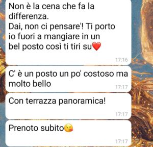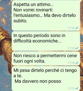 Quando l’ho conosciuta, circa 4 mesi fa, mi sembrava diversa dalle altre: solare, divertente, con quella leggerezza che ti fa venire voglia di uscire anche dopo una giornata storta. Per questo, quando ho iniziato ad avere difficoltà economiche, ho trovato il coraggio di dirglielo. Non è facile ammettere certe cose, soprattutto da uomo: ti senti meno, come se stessi chiedendo l’elemosina. Lei, però, mi aveva rassicurato. Mi aveva detto: “Non ti preoccupare, non è un problema. Mi basta stare assieme, io non guardo quelle cose…”