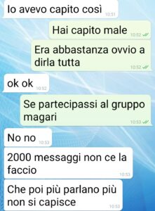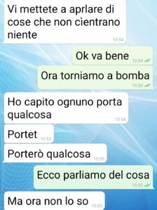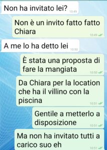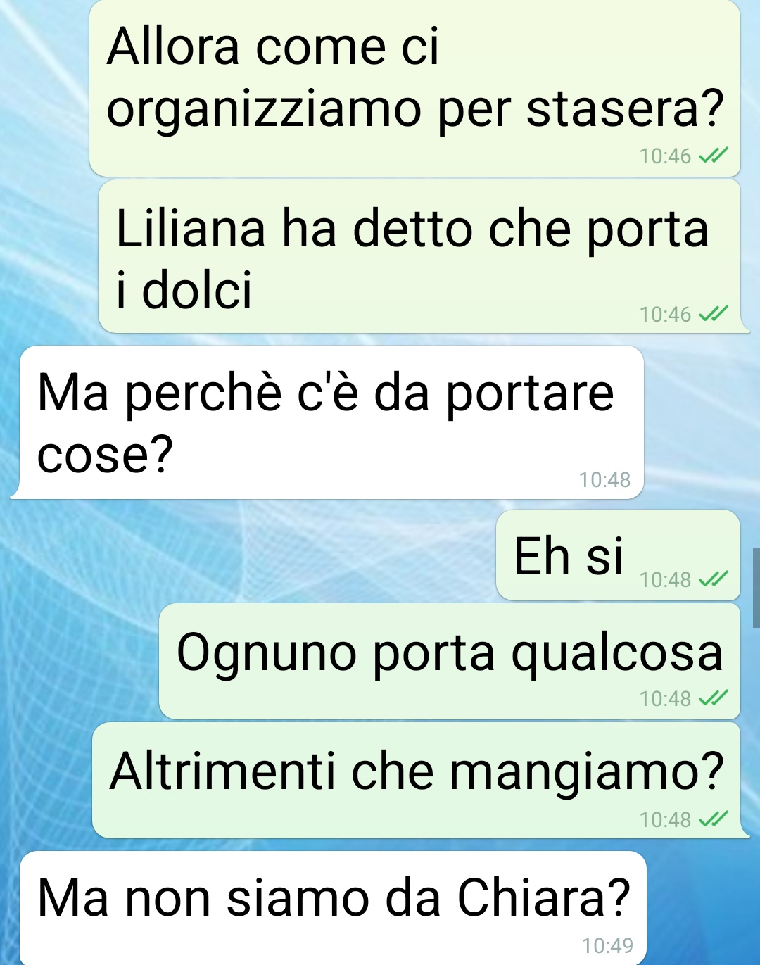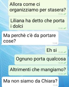Si organizza in questo villino di Chiara. Si organizza! Non che lei ha invitato tutti. E già qui fiumi di discorsi per far capire la situazione a questa mia amica della chat (non dico il nome, chi ci manca solo che la legge…poi scappo in Antartide). E poi il clou. Ognuno porta qualcosa per le cibarie. Chi ha deciso chi deve portare cosa? Una ossessa è diventata. E fare una insalata di riso adesso richiede sforzi titanici. E della retromarcia finale ne vogliamo parlare? Nota per me: mai più coinvolgerla.”