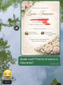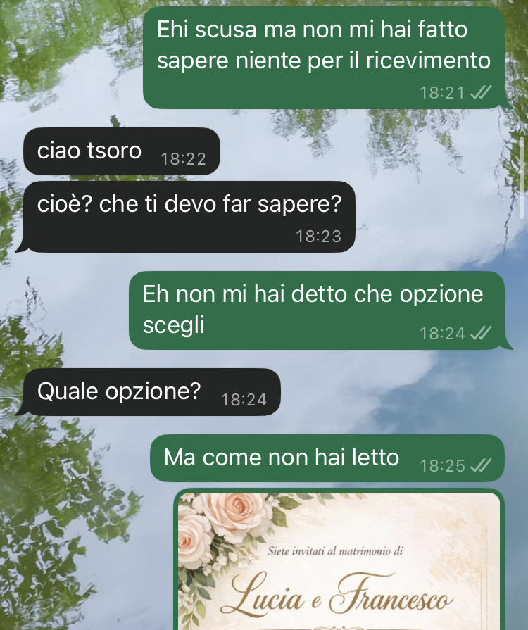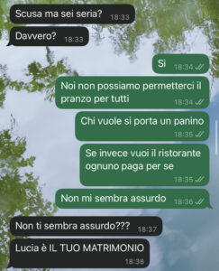 E la cosa peggiore è che ti rimane quel senso di amarezza, quella delusione… e non sai se riderci sopra o arrabbiarti. Per il mio matrimonio ho dovuto fare una scelta, niente di che, forse un po’ insolito ma non mi sembra un dramma. Speravo mi capisse, da parte sua mi sarei aspettata almeno un minimo di comprensione; invece, niente… mi ha dato solo una grande delusione. Non è stata per niente comprensiva. Sto piangendo da due giorni. Non è facile, ma si va avanti, no?