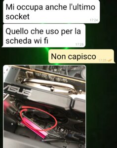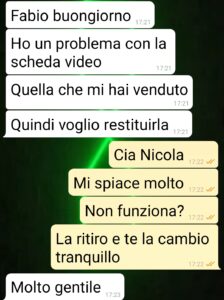 Ciao a tutti spuntatori. Io sono Fabio e gestisco un negozio di elettronica di cui sono anche socio proprietario. Perché ve lo dico? Perché è importante per il contesto. Questo mio amico, Nicola, che conosco da 20 anni, ha fatto un upgrade del pc. Ha comprato i pezzi nuovi da me tra cui questa scheda grafica, oggetto del contendere. Mi ha scritto dicendo che non andava bene. Pronto a cambiarla subito, pensando ad un difetto di fabbrica. E invece il problema non è la scheda ma lo spazio che ha a disposizione. Lo capite tutti che se apri e monti e funziona e rimandi indietro quell’apparecchio ormai è usato no? Senza sigilli, senza adesivi… non si può rivendere “nuovo”. Lui sta cosa non la capisce. E via all’escalation della chat. Mi viene da ridere, ma amaro. È possibile che basti così poco per mettere in discussione un’amicizia, ok non fraterna, ma che dura da tanto? Sono perplesso…”