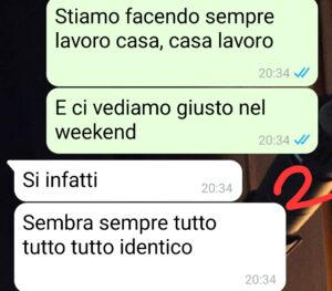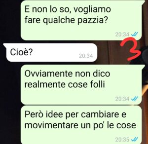 “Non so se sto esagerando io o se certe frasi andrebbero pesate meglio prima di dirle. Fatto sta che ieri parlavamo del solito: lavoro, settimane tutte uguali, uscite sempre il weekend, la sensazione di fare copia-incolla delle giornate. A un certo punto le ho detto una cosa tipo “forse dovremmo osare un po’ di più”, così, senza pensarci troppo. Lei così ha un idea e poi a un certo punto è sparita. Ed ecco che è successo”