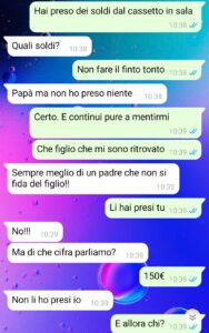 Mio figlio, poi, è l’esempio perfetto di questa generazione: intelligente, sveglio, ma allergico a ogni forma di impegno. Parla tanto, sogna tanto, ma di concreto fa poco o niente. E io non capisco se è colpa mia, se ho sbagliato a dargli troppo, o se è proprio cambiato tutto. I soldi però per me hanno ancora un valore preciso ed è per questo che quando ho visto magicamente sparire quei 150euro, gli ho subito scritto.”