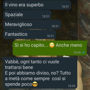 Alla fine arriva il conto, tira fuori il portafoglio, mi guarda, sorride: “Facciamo metà?”.
