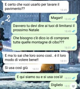 Mia moglie ha una grande famiglia meridionale che è ossessionata dal cibo: è un continuo inviare roba da mangiare e bere, casse e casse di generi alimentari.. e noi davvero non sappiamo più cosa farne!!.. A volte penso che sarebbe il caso di aprire un negozio e rivendere tutta sta roba!! Perché oltre a non fare bene alla salute – dato che non si tratta mai di cibo normale ma sempre di dolci e cose grasse!! – c’è anche il problema della quantità di cose tutte uguali inviate a blocchi tutte insieme: chili di salsa di pomodoro in estate o valanghe di dolci in inverno!!