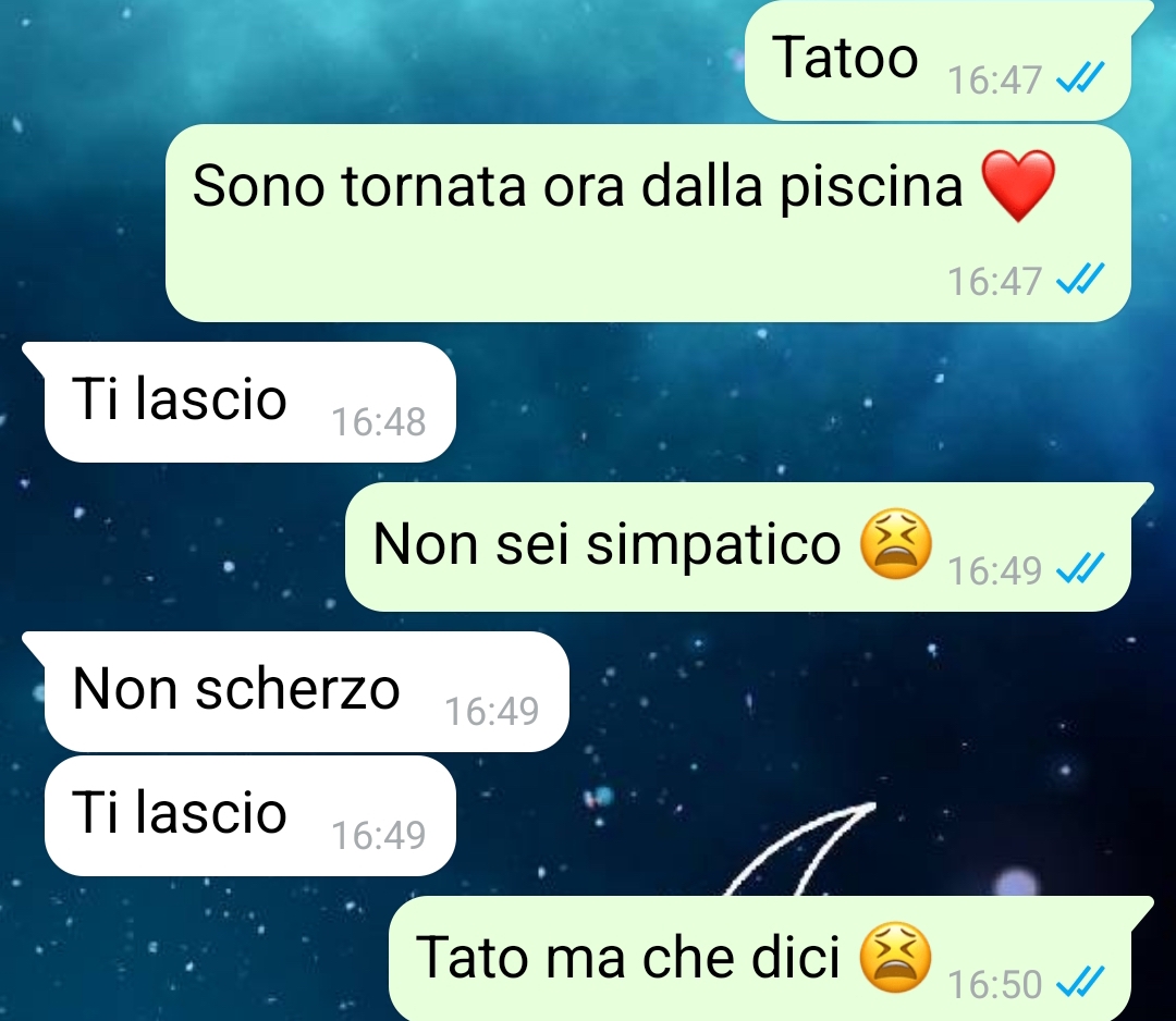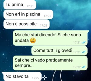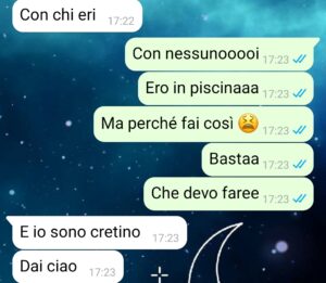 Che nemmeno esiste se lo è inventato lui secondo me perché qualcosa sotto sotto nasconde e ha colto l’occasione per liberarsi di me. Non lo accetto come è andata e il motivo mi lascia sbalordita perché è da fuori di meloneeee.