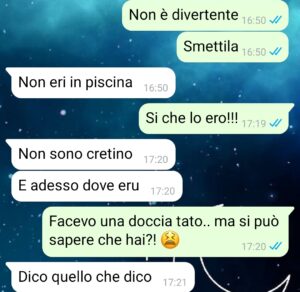 Per favore ditemelo perché lo devo convincere in qualche modo che sono solo andata in piscina e che non ho fatto niente di male!