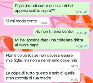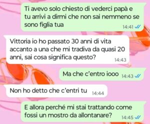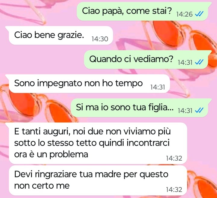 “Ciao Spunte Blu, sono una ragazza che sta soffrendo moltissimo in questo momento. I miei stanno divorziando perché mia madre tradiva mio padre da anni a quanto pare e lui appena l’ha scoperto è andato immediatamente via di casa chiedendo il divorzio. Papà mi manca tantissimo e da quando è andato via di casa io e lui non ci vediamo quasi mai, questa situazione mi fa soffrire davvero molto anche perché lui non mi cerca mai così oggi mi sono fatta avanti e gli ho chiesto di vederci. Dopo qualche risposta brutta papà si è finalmente un po’ sciolto e sbloccato con me e di questo sono felice ma credetemi non so che fare e con chi parlare adesso perché soffro davvero tanto per questo e di mio sono sempre stata una ragazza molto chiusa e con pochissime amiche con cui sfogarmi anzi quasi nessuna amica se devo essere sincera… ho un carattere particolare ecco e ovviamente odio mia madre per quello che ha fatto”