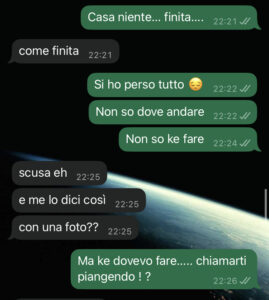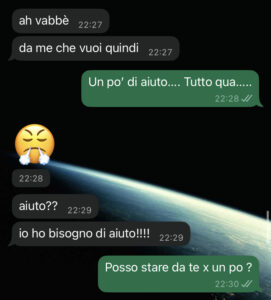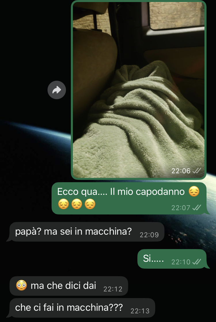 Vabbè speravo di potermi appoggiare a lui, speravo che riuscisse a darmi una mano. Ad aiutare il suo povero papà. Quindi gli ho scritto… ma è stato una delusione totale. Purtroppo mi sono accorto di aver cresciuto un figlio davvero molto egoista e sono rimasto malissimo per le parole che mi ha detto. Mi ha fatto soffrire, non mi vergogno ad ammetterlo. Vi faccio leggere la nostra conversazione, sperando che i vostri figli siano migliori. Buon anno nuovo a tutti.. ciao ciao…”