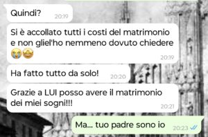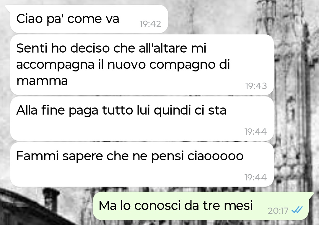 “Mia figlia non vuole che la accompagno all’altare. Sua madre si è fidanzata con un uomo che sta molto bene in fatto di soldi e dato che si è offerto di pagare tutto lui, vuole farsi portare da lui… anche se si conoscono solo da 3 mesi.
