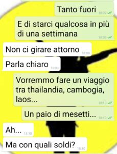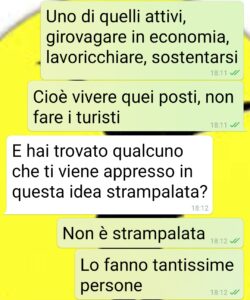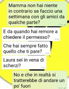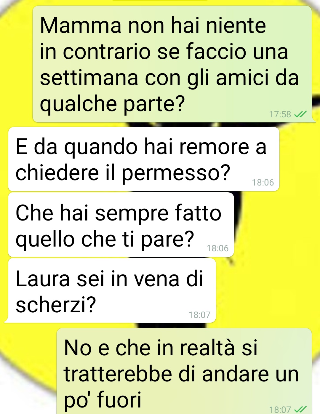 Ciao Spunte blu, io sono Laura e questa è la chat con mia mamma. So già che verrò criticata da molti, ma non mi importa. Se certe persone non vedono più in profondità io non posso farci nulla. Mi basta che mia mamma abbia capito (speriamo…). Io ho 23 anni e ho una sorella, Cristina, più grande di me di 11 mesi. Abbiamo un bel rapporto ma siamo diametralmente opposte. Lei inquadrata e con obiettivi precisi, io ribelle, sognatrice e pronta a ciò che la vita mi porrà di fronte. Io al contrario di lei non vado all’università. Il richiamo di viaggiare e vivere il mondo è la mia linfa. Sono una nomade che si sta sempre più spingendo verso una backpacker. E questo negli screen è quello che è venuto fuori con mia mamma quando le ho chiesto aiuto in proposito. Forse che con la calma e il dialogo si possono evitare disastri e incrinare certezze che sembrano granitiche.”