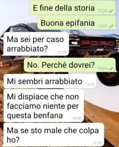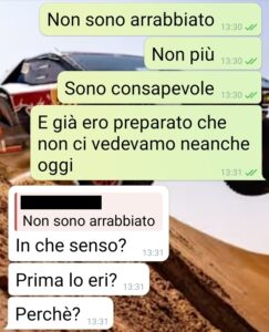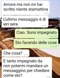 “Oggi è il 6 gennaio 2026, giorno dell’Epifania. Sono le ore 18:50 e mi sono deciso a mandarvi questi screen. Sono della conversazione che ho avuto oggi, in tarda mattinata, con la mia compagna Paola. Ve li mando da casa dei miei, dove sono venuto dopo pranzo. E ve li invio per sentire cosa può pensare qualcuno che non prova la rabbia che provo adesso io. Perché, ve lo anticipo, sto ancora aspettando una risposta al mio ultimo messaggio. E la cosa mi fa incazzare. Domenica 28 dicembre siamo a casa nostra. Lei si sente poco bene, misuriamo la febbre e ha 37.2, sarà questa maledetta influenza che gira. La prende malissimo e si arriva all’assurdità che fa venire suo fratello a prenderla e se ne va dai suoi. È andata in panico dice, è ha bisogno della sua comfort zone. Risultato: arriviamo a oggi, dopo 10 giorni in cui non la vedo e comunichiamo solo via messaggio. Sinceramente non capisco cosa dovrei comprendere ancora. Mi sembra di aver buttato 4 anni di vita in questa relazione.”