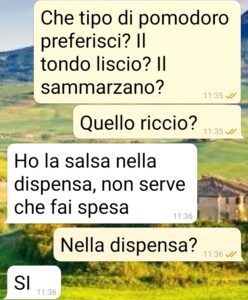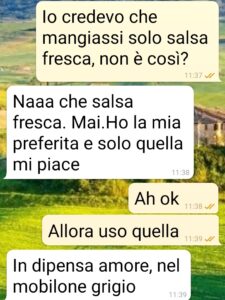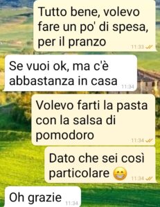Ciao spunte, come iniziare meglio una convivenza se non mandandovi gli screen del primo misunderstanding (chiamiamolo così…) col mio ragazzo? Al primo risveglio a casa sua? Mi ci sono trasferita praticamente ieri sera e oggi, con lui a lavoro, volevo prendere contatto e preparare il pranzo. Ci conosciamo da un anno e il nostro è stato un rapporto a distanza. E allora, dato che io lavoro in smart, perché non provare a conoscerci meglio? Eccomi quindi da lui e vogliosa di preparargli una semplice pasta col pomodoro, che non abbiamo mai mangiato assieme perché lui è inflessibile. No mangia sugo imbottigliato. E io povera cretina oggi voglio fargli una bella salsa fresca. Ma no, lui ha la sua nella dispensa. E crolla la mia convinzione sulla freschezza. Mangia solo ketchup! Normale no? Io intontita. Da leggere.”