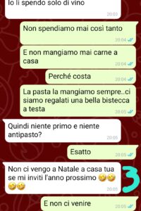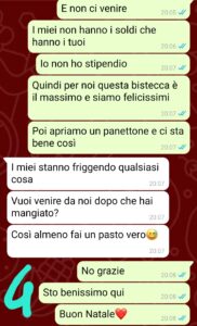 “Ciao a tutti, sono una ragazza di 23 anni e mi sono messa da poco insieme a un ragazzo conosciuto online. Ci siamo visti poche volte ma finora mi sembrava che andasse tutto bene…insomma non ho mai pensato che fosse l’uomo della mia vita ma che magari, conoscendoci meglio, potesse nascere una relazione duratura…adesso non lo so più. Non voglio fare l’errore di giudicarlo da questi pochi messaggi, ma sicuramente qualcosa di questa chat mi ha dato fastidio…forse sbaglio io…non so. Vivo in una famiglia molto umile, studio all’università e ho quasi finito, ma non lavoro. Nella nostra famiglia cerchiamo di risparmiare sempre, perché il costo della vita è aumentato e le entrate, negli anni, sono rimaste le stesse, poche. Siamo felici però. Felici veramente. Non cambierei la mia infanzia e la mia adolescenza con quella di nessun altro. I miei mi amano e si amano veramente e questo ci basta. Non ho mai fatto una vacanza con loro, né siamo mai andati a cena fuori..mangiamo spesso cose economiche ma comunque nutrienti. A Natale quindi abbiamo deciso di concederci qualcosa che solitamente non possiamo permetterci, ma sembra che la cosa sia strana per questo ragazzo…non lo so, per me è tutto normale e sono anche felice di come è andato il mio Natale.”