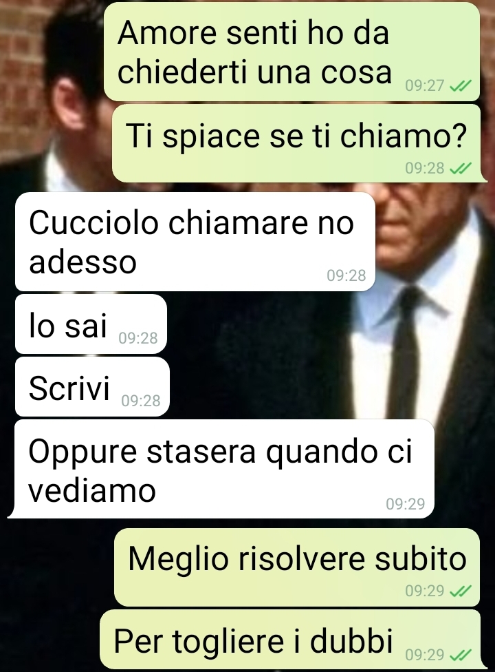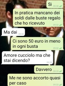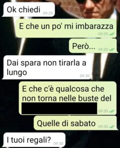 Ciao spunte, ciao lettori. Questa chat mi sento di mandarvela perché …è giusto che ne veniate a conoscenza. Di come i dubbi si annidano nell’animo  più fiducioso e incrollabile di un fidanzato. E di come non ci può fidare delle persone più care e insospettabili. Da un lato mi rimane l’incredulità e la rabbia per quanto successo. Dall’altro il sollievo che poteva essere peggio. Andiamo ai fatti che è meglio, poi ognuno tirerà le sue conclusioni. Mi sono laureato e mi sono convinto per una festicciola simbolica, una pizzata con gli amici e parenti più stretti, 20 persone. A fine serata ho raccolto i regali e tutto bene fino a ieri. Quando parlando casualmente con mia madre scopro che forse ha sbagliato le banconote in busta. Mi ha dato 50 euro meno di quanto pensava. Ma anche nonna ha sbagliato. E un paio di zii…Devo chiedere alla mia fidanzata, che durante la festa mi ha fatto da “cerimoniere” e segretaria.”