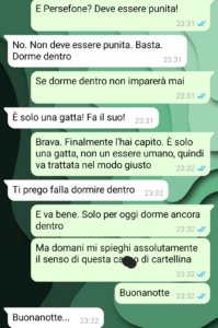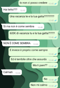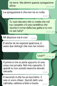 “Stavo cercando con tutto me stesso di rimanere calmo e continuare sulla mia linea ovvero quella della logica. Quando si è calmi, si ragiona, mi permetto anche di dire quando si è un po’ intelligenti come nel mio caso, una soluzione pacifica si trova sempre. E io l’avevo trovata e anche molto semplice. La gatta trattata da gatta e quindi in maniera super tranquilla e controllata, portata fuori di casa, per rimanerci. C’è un motivo se hanno inventato le cucce e se queste sanno sempre fuori casa, no? Il problema è che Marzia non voleva sentire ragione, e stava, già lo sentivo, per scoppiare una di quelle litigate che poi fanno davvero male. Ma non è successo, non è successo perché, come avete letto, ho trovato quella cartellina segreta. Ora, sinceramente parlando, quale persona normale nasconde una cartellina inerente al proprio gatto? Ma il problema non è tanto quello, il problema, serio davvero, è il contenuto della cartellina. Se ancora ci penso, e soprattutto se ancora penso poi a com’è finita, mi sento un estraneo in questa realtà. Tutto assurdo…”