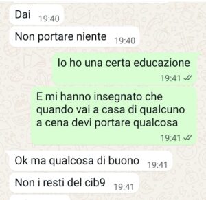 Siccome io studio economia , certi ragionamenti fanno ormai parte del mio status of mind, della mia forma mentis. So come vanno avanti certe trattative e fidatevi, accasare un figlio maschio di bassa statura è una trattativa, come fosse una compravendita di una società. Tutti vogliamo capitalizzare i nostri investimenti. Me compresa. Quindi il mio investimento per questa cena – che mi porta a un capitale che ho già acquisito (il mio ragazzo), e che corrisponde per lo più a quello che in termini tecnici si chiama rottura di zebedei – è pari a una confezione di squisiti petali di mele.