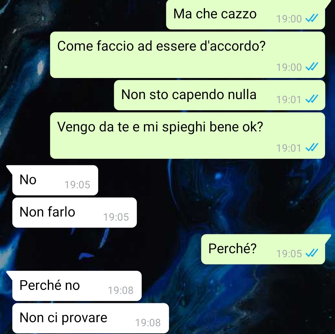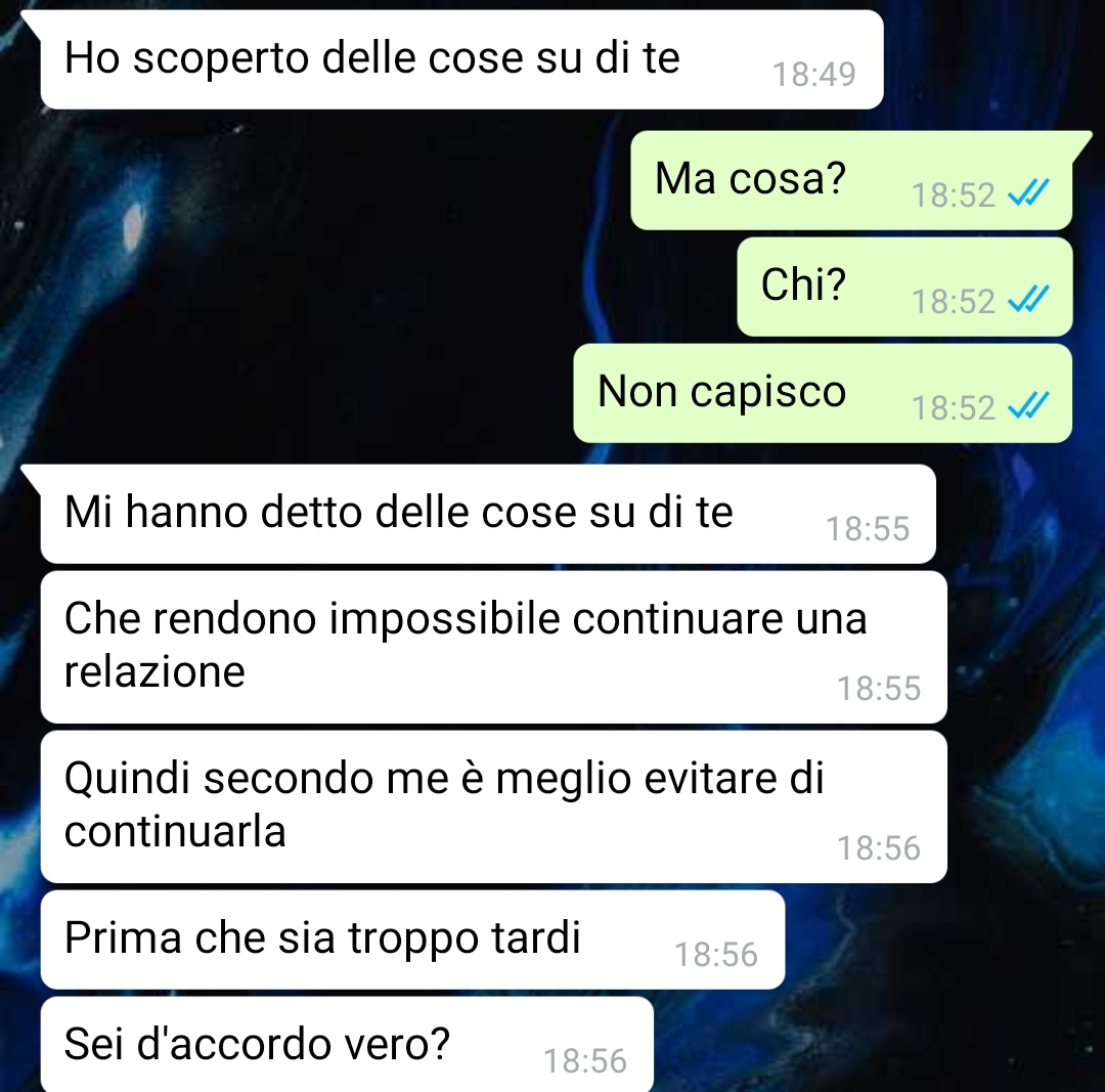 In sostanza lei è venuta a scoprire tramite un pettegolezzo della madre delle cose sulla mia famiglia, sul passato della mia famiglia e nello specifico dei miei genitori che le hanno fatto decidere di non voler più avere nessun tipo di relazione e di rapporto con me.