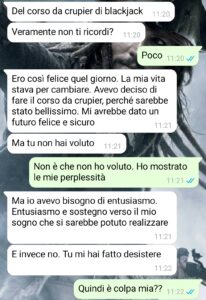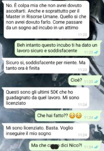 “Tutti mi dicono che sono una persona troppo rigida, troppo “con i piedi per terra” che forse non sogna più. Sapete cosa ne penso io? Sono d’accordo, ma non lo vedo come un difetto, lo vedo come un pregio e una conquista. Chi vive meglio? Chi vive di sogni che non si possono realizzare e di rimpianti che lo perseguitano giorno e notte? Oppure le persone che accettano che non sempre tutto si può fare nella vita, e accettano le piccolezze della vita, quelle piccole ma quotidiane gioie che ti accompagnano e che, se accolte nel modo giusto, possono addolcire l’esistenza? Io sono tra queste persone, perché non voglio farmi inutilmente del male. E pensavo che anche il mio fidanzato Nicolò fosse così, ma mi sbagliavo. Finalmente, dopo anni a dir poco complicati, avevamo una nostra stabilità: una casa in affitto, un cane, un lavoro più che dignitoso per entrambi, e la voglia, perlomeno da parte mia, di vivere questa vita come la stavamo vivendo ma valorizzandola. Tutto andava bene, perlomeno fino a quando questo bell’equilibrio non è stato brutalmente scosso da quell’inaspettato messaggio.”