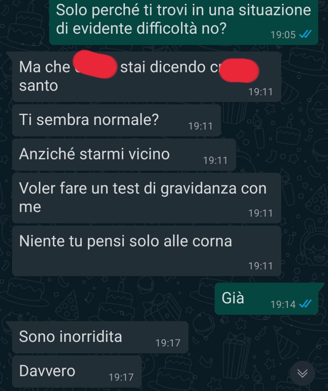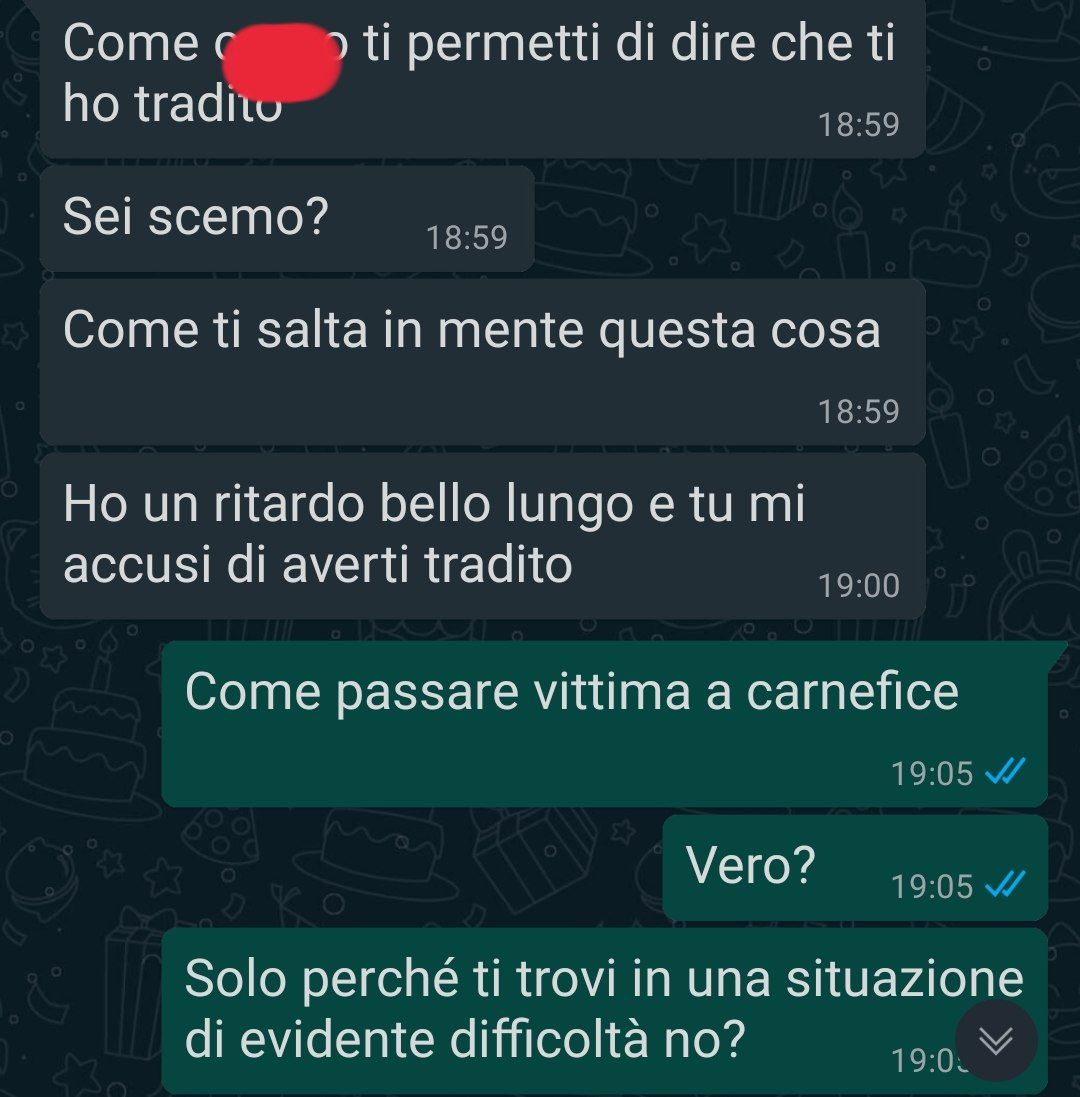 Io sapevo del tradimento già da tempo, sapevo tutto, ma sono sempre stato un po’ un codardo e quindi niente, non ho mai agito e me ne sono sempre stato zitto… Ovviamente leggendo capirete tutti, vi sono delle belle sorprese”
