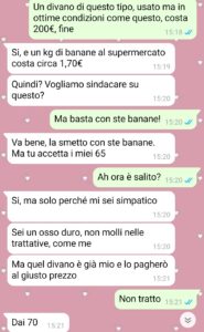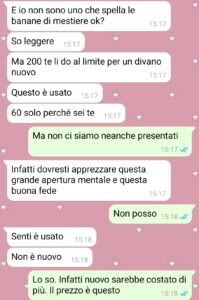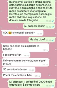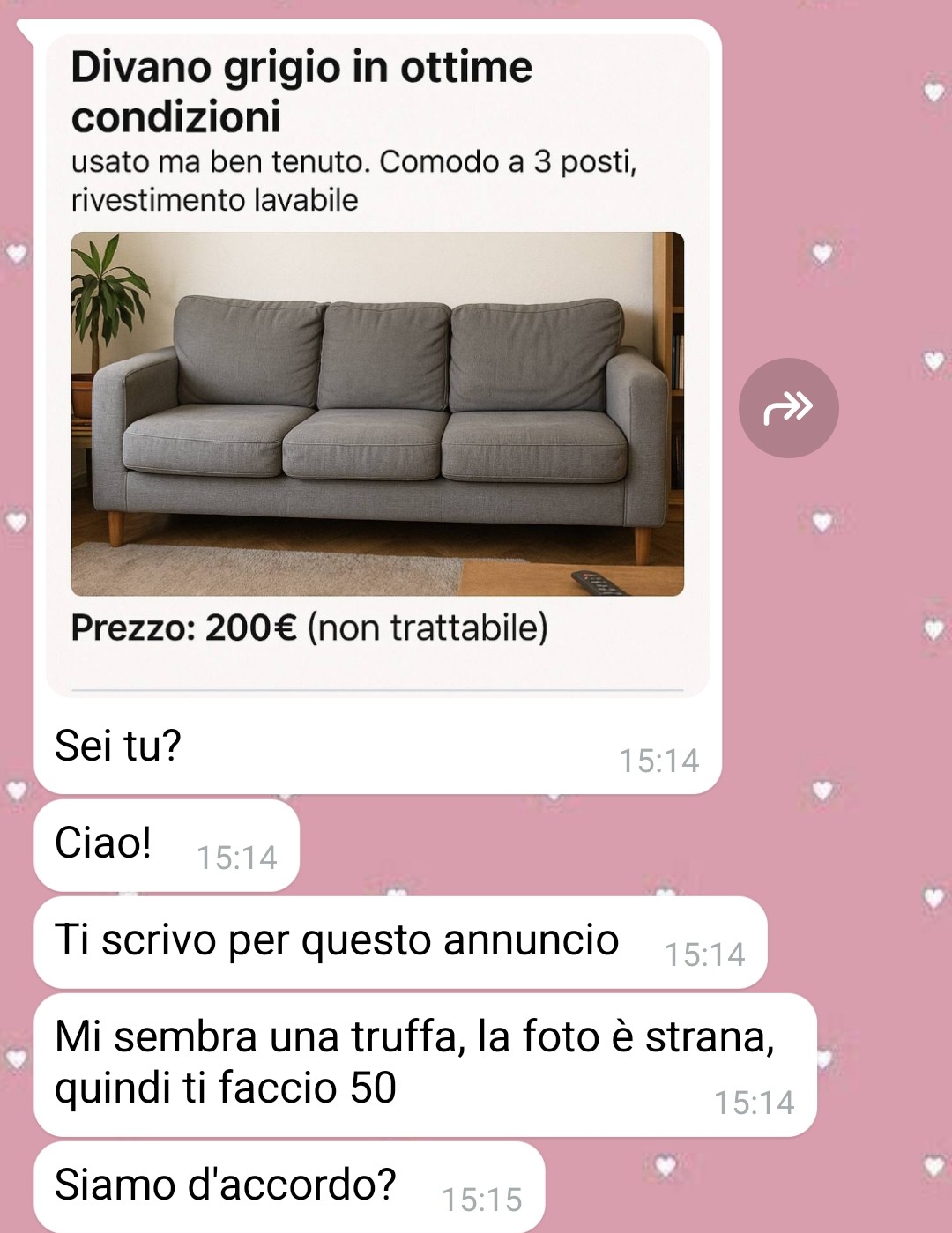 “Poco tempo fa mi contatta mio figlio e mi dice se posso vendere il suo divano su un sito online da lui indicato: non aveva tempo di farlo lui, gli servivano soldi in fretta, e non poteva permettersi di tenerlo in casa a prendere polvere. L’ho messo in vendita con prezzo chiaro e tutto. Pensavo: “Che ci vorrà mai? Arriva qualcuno, paga, se lo porta via e fine della storia”. E invece mi sono ritrovato dentro a una delle conversazioni più assurde della mia vita, e ne ho avute tante, sia dal vivo che non. All’inizio mi sembrava solo un acquirente un po’ insistente, uno di quelli che prova a tirare sul prezzo “tanto per sport”. Mi dicevo: “Ok, è normale, tutti cercano l’affare”. Quindi non l’ho bloccato subito. Mi sono detto: “Aspetta, magari alla fine compra davvero, e io mi libero del divano senza sbattermi più”. Il problema è che ogni volta che rispondeva, alzava l’asticella dell’assurdo. Il problema, in ogni caso, non è neanche tanto quello…il problema è quello che purtroppo ho scoperto alla fine…”