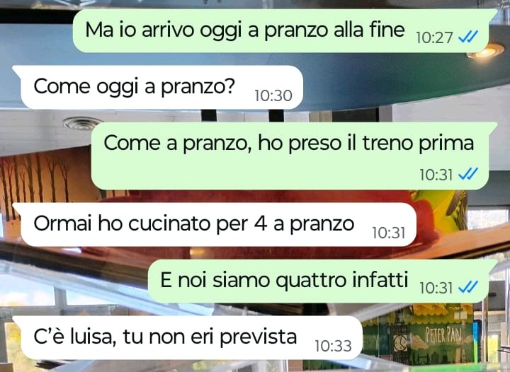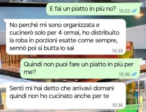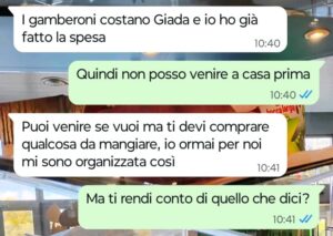 “Ciao Spunte Blu sono Giada e frequento il terzo anno di università. Vivo a Roma, ho affittato casa con due mie amiche perché di base sono di un piccolo paese vicino Roma e far la pendolare per tornare a casa tutti i giorni per me sarebbe impossibile. A casa però ci torno comunque spesso, di solito 2 weekend al mese. Oggi mi è saltata la lezione all’uni e quindi ho pensato di rientrare a casa prima, ma appena ho scritto a mia mamma che il programma era cambiato e che sarei arrivata a casa un giorno prima lei è impazzita come sempre, cominciandomi a dare risposte di merda, com’è suo solito fare. Premessa importante: mia mamma è una persona che va in fissa facilmente purtroppo e secondo me ha un sacco di problemi mentali mai diagnosticati ne curati… da ragazza è stata anche anoressica e questa penso sia una cosa importante da dire e che spiega le sue risposte e la chat mia con lei di oggi. Insomma la fissa più grande di mia mamma è sempre stata il cibo e purtroppo io e mio fratello ne abbiamo sempre pagato le conseguenze fin da piccoli… sono stanca di questa situazione credetemi e sto pensando di non tornare davvero più a casa adesso dopo l’ultima discussione avuta con lei poco fa. Cosa fareste voi se vi trovaste a casa una mamma come la mia?”