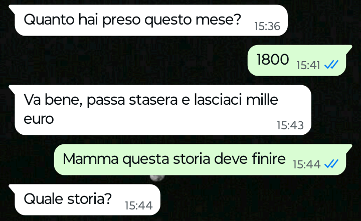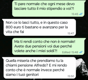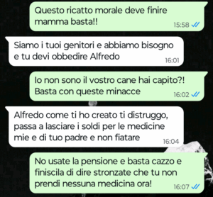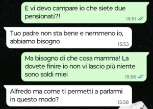 “Ciao Spunte Blu mi chiamo Alfredo e da diversi anni a questa parte ormai sto vivendo una situazione a dir poco paradossale per colpa dei miei genitori e in particolare di mia madre. Sono figlio unico ho il mio lavoro e vivo per conto mio. I miei sono ancora piuttosto giovani, mia madre è riuscita ad andare in pensione abbastanza presto (ex insegnante di scuole medie) e così anche mio padre. Oggi pomeriggio mi scrive mia madre per la solita richiesta che mi avanza ormai da anni e che si riferisce proprio alla situazione paradossale di cui vi voglio parlare. Leggete la chat e non crederete ai vostri occhi ne sono sicuro”