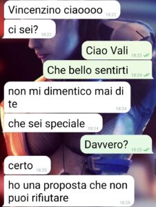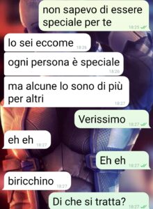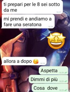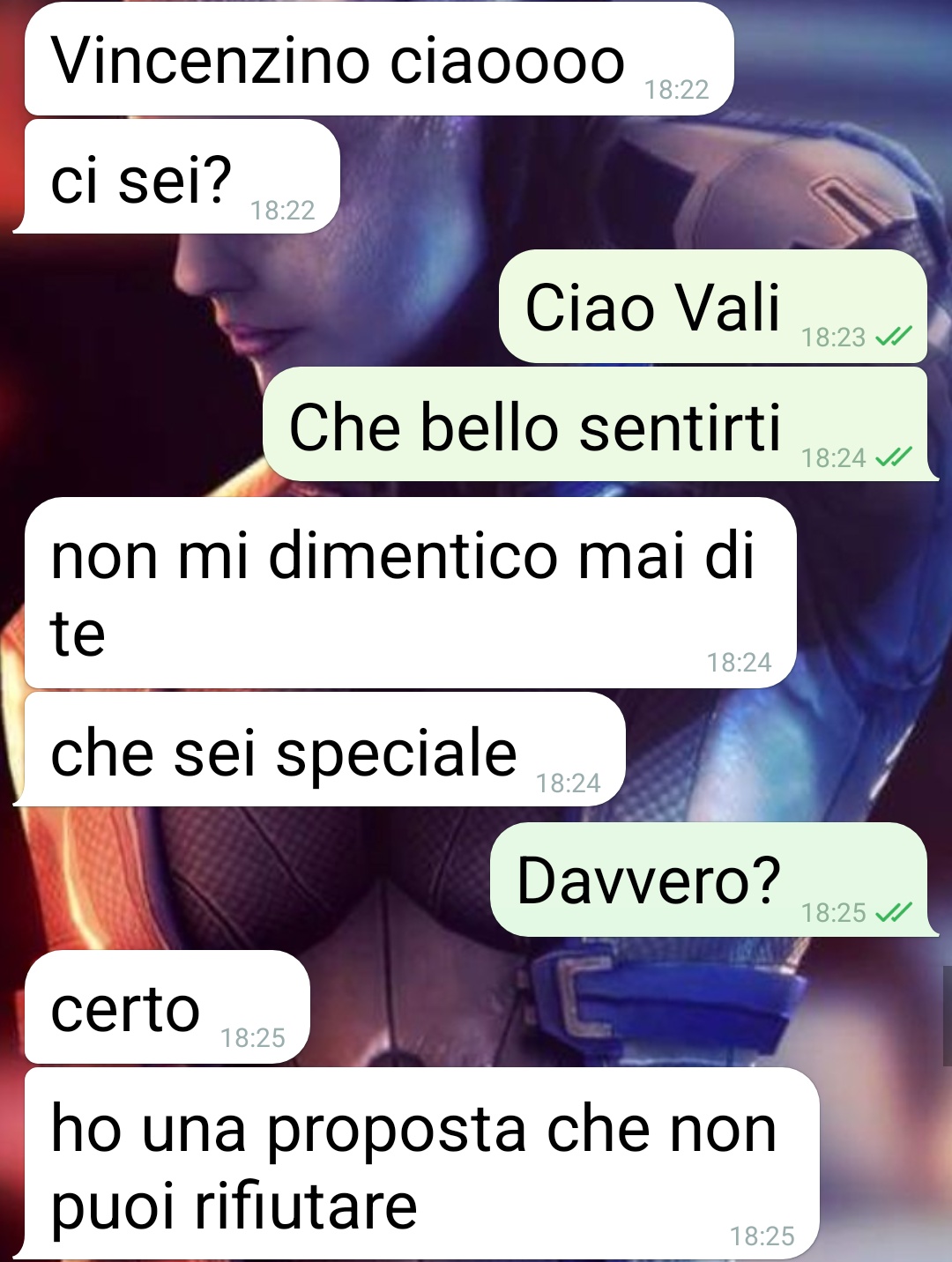 Io sono Vincenzo amici di spunte e a dirla tutta non so da dove cominciare. Mi viene da partire dalla fine, ma forse faccio confusione. Alla fine ci sono pure andato. E non mi sono pure preso una multa solo per pietà del poliziotto. No ma così non si capisce. Vado con ordine. Metto solo la premessa che magari leggendo diviene ovvia ma che mi serve ripetere per me stesso; sono un cretino, stupido, innamorato e zerbino. Ok i fatti ora. Con Valeria ci conosciamo da anni, stessa comitiva e tante uscite ma di gruppone, in piazza, dove praticamente becchi tutto il paese… ci vado dietro palesemente e lei non mi ha mai respinto ma nemmeno mi fa avvicinare più di tanto. Alle mie richieste di uscire da soli è sempre “forse in seguito, vediamo…”. Ma ieri mi scrive lei. Ha capitolato penso! Tra un messaggio e l’altro scopro la mia stupidità…”
