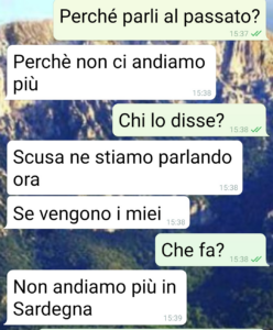 Io sono Gavina signori di spunte blu e questa che vi metto è la litigata con Vito. Noi stiamo a Milano da 20 anni ma io sono sarda e lui pugliese. E tra due settimane dovremmo recarci dalle mie parti. Mia nonna compie 100 anni e mio fratello si sposa. Non so se mi spiego… E ho scritto dovremmo perché lui adesso non verrà più. E non solo è in torto marcio, e leggendo capirete il perché, ma vuole farmi venire pure sensi di colpa che non ho motivo di avere. Perché qualche mese fa i suoi erano qua da noi quando suo padre ha avuto l’incidente (vivono in Puglia). Ed è stato operato per la prima volta. Ora deve fare la seconda operazione di altre 2 o 3 addirittura. E il medico che ha fatto la prima e che lo segue gliela ha anticipata. Scusa buona per Vito per creare problemi inesistenti.”