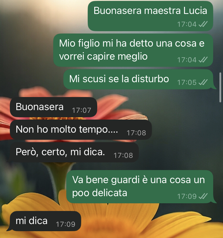 Ero lì, a chiedermi se forse stavo esagerando, se avevo capito male, e ho deciso di prendere il telefono e scrivere un messaggio alla maestra. Ho iniziato in modo tranquillo, quasi timorosa, cercando solo di capire cosa fosse successo. Ma, man mano che scrivevo e ricevevo le risposte… beh, le cose hanno preso una piega che non mi aspettavo.