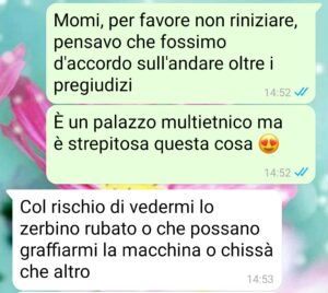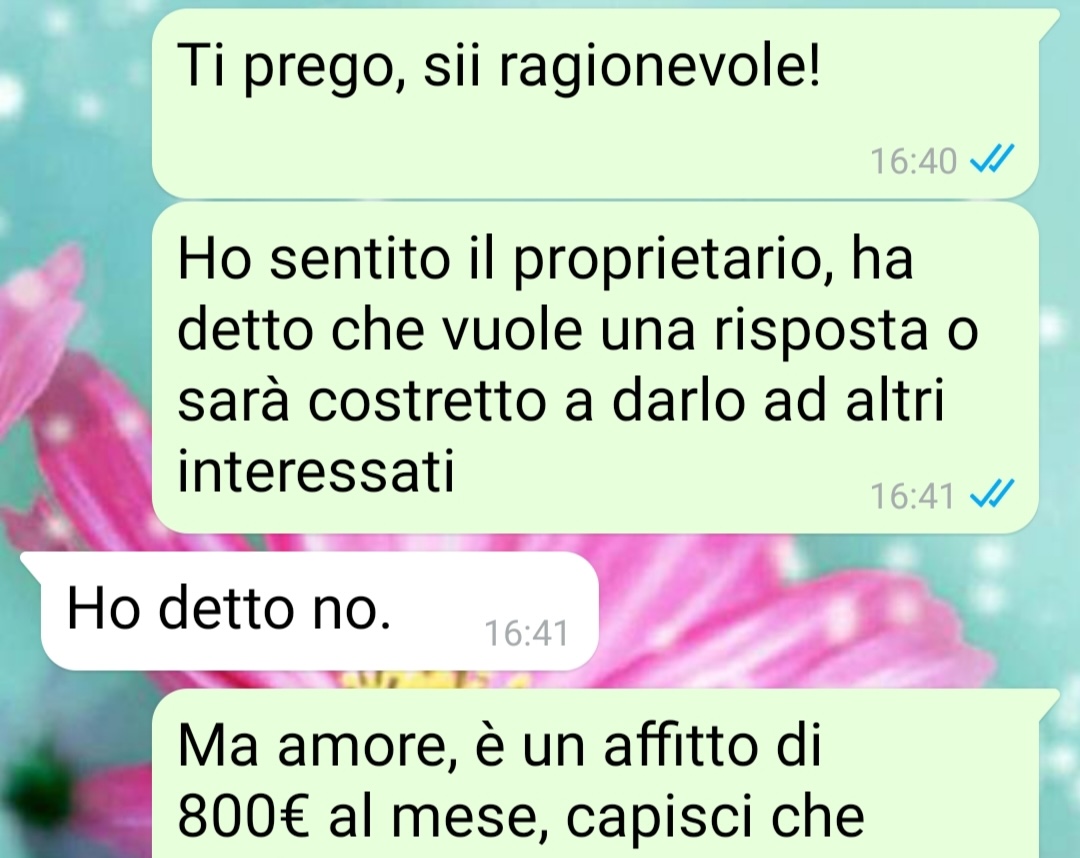 “Ciao, mi chiamo Stefania e sono fidanzata con Mirko da 8 anni, e siamo arrivati nella fase di convivenza. Stiamo cercando la casa però siamo ancora in alto mare: motivo? Mirko non vuole andare a vivere in una splendida casa che ho trovato perché al piano di sotto abita una famiglia africana.. sì ho un fidanzato ottuso ma ha anche delle qualità stupende. È un uomo dolce, gentile e premuroso e io lo amo tanto, dopotutto abbiamo condiviso tanto insieme. Ecco, però c’è qualcosa che mi turba, qualcosa che non mi torna.. qualcosa che mi dice che forse dovrei prendere una drastica decisione..”