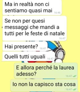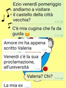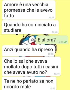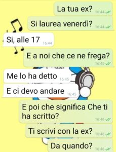 “La ex del mio fidanzato lo pretende alla sua laurea per una promessa. Solo a me sta cosa suona stranamente strana? Per non dire senza senso? Cioè chiariamo. Questi si lasciano e a detta di lui nemmeno si sentono da 3 anni. E ora mi spunta che c’è la laurea di questa Valeria. Ma chi diavolo invita alla laurea un ex? Mi ha detto che è una vecchia promessa. Ma le promesse sono legate al valore che le dai e al rapporto con chi le hai stipulate. Può avere la stessa valenza una promessa, adesso da ex, fatta anni prima quando si era fidanzati? Cazzo allora quelli che divorziano? Non si sono promessi amore per la vita? Che discorsi del cavolo mi sono dovuta sorbire? E fosse solo quello! Anche tutto il resto, di come parla e come giustifica “Vali”, di come sembra contento, stona maledettamente con quella che dovrebbe essere la situazione attuale. Qualcuno che mi da manforte? O sono troppo estrema io? Però alla fine anche a lui gli rode il culo se spunta qualcuno di inatteso…”