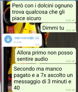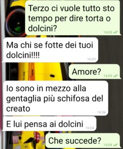Meglio andare ai fatti. Sono a lavorare, lei invece è andata a rinnovare la patente che stava scadendo o è scaduta non ricordo bene. Le scrivo per una comunicazione di servizio circa la serata imminente. Siamo infatti invitati a casa di mia madre per cena con i miei fratelli e sorelle. I miei problemi erano se portare una torta o dolcetti misti. E mi è arrivato addosso l’uragano inaspettato. Quella innominabile impiegata l’ha fatta grossa. Ha detto a mia moglie che si vede che ha qualche ruga in più rispetto alle foto che ha presentato. Apriti cielo.”